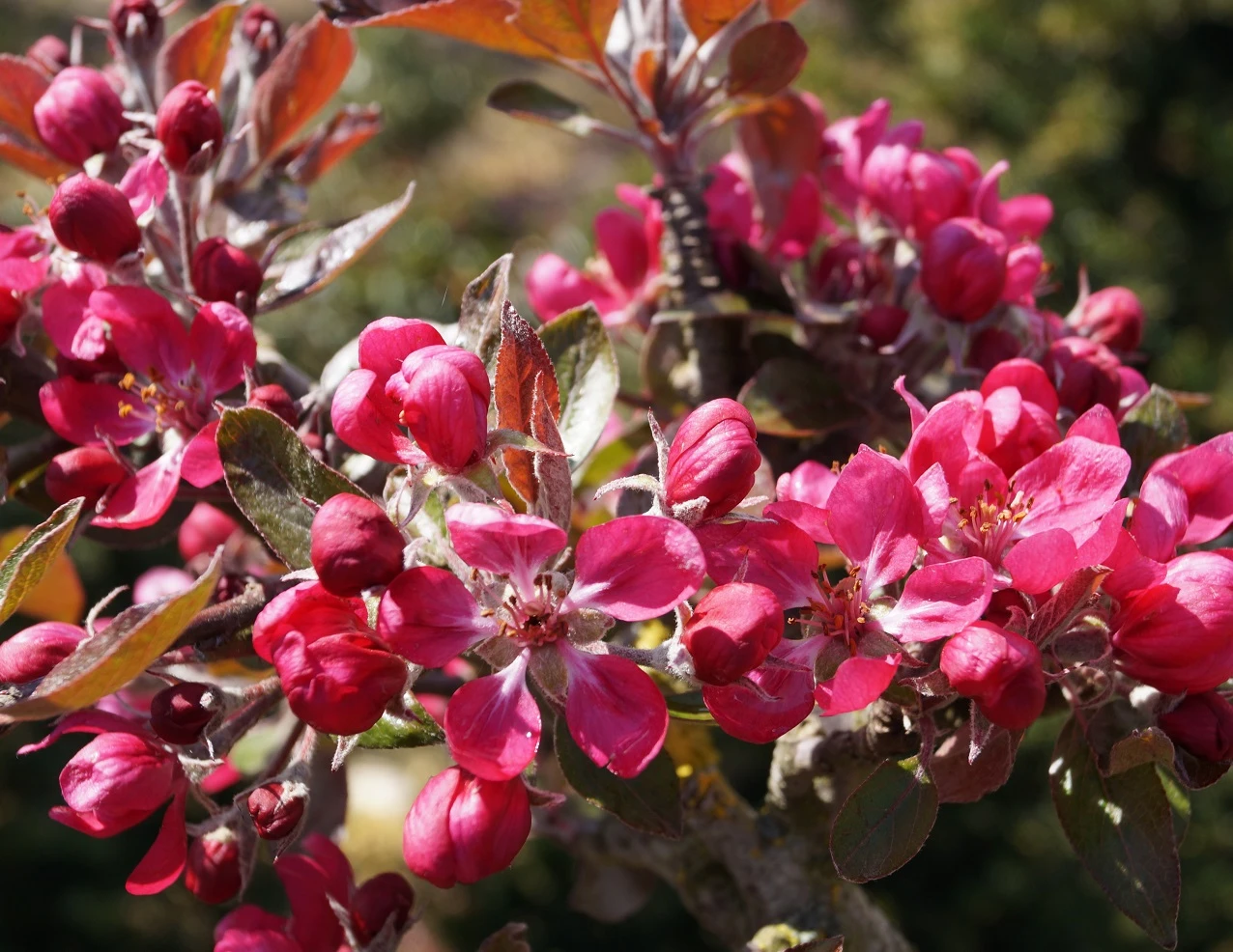 pinkfarbene Blüten, rote Äpfel mit rotem Fleisch